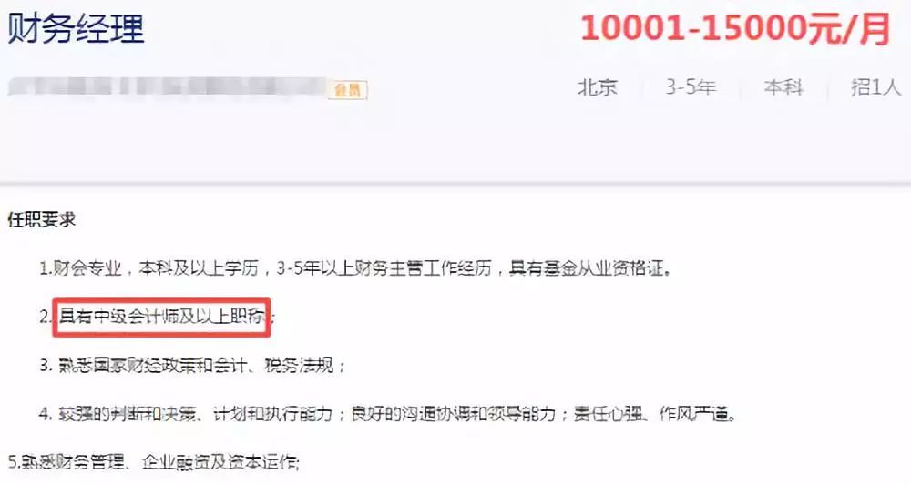 从招聘的角度说,对一些岗位提出“持有中级会计职称”这个要求,比如总账会计、会计主管和财务经理,三个岗位的应聘者如果没有中级职称,是根本进不了面试环节的。